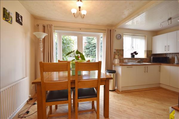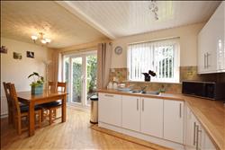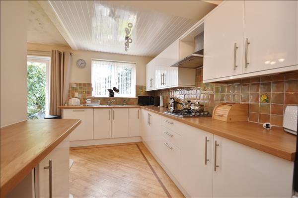Fitted with range of wall and base units with high gloss white doors, oak effect laminated worktops and inset one and a half bowl stainless steel sink. Built in electric double oven with separate gas hob and extractor hood. Integrated dishwasher and fridge. Ceramic tiled splashbacks. Kardean type flooring. Double glazed white uPVC window to rear. Doors to understairs cupboard/pantry and garage