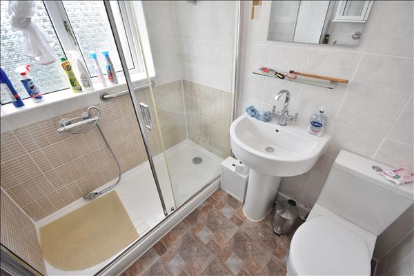 Fitted with modern three piece suite in white comprising close coupled w.c., pedestal wash basin and large shower tray with sliding door and double glazed white uPVC window to rear. Chrome-plated towel radiator. This room originally housed a bath.